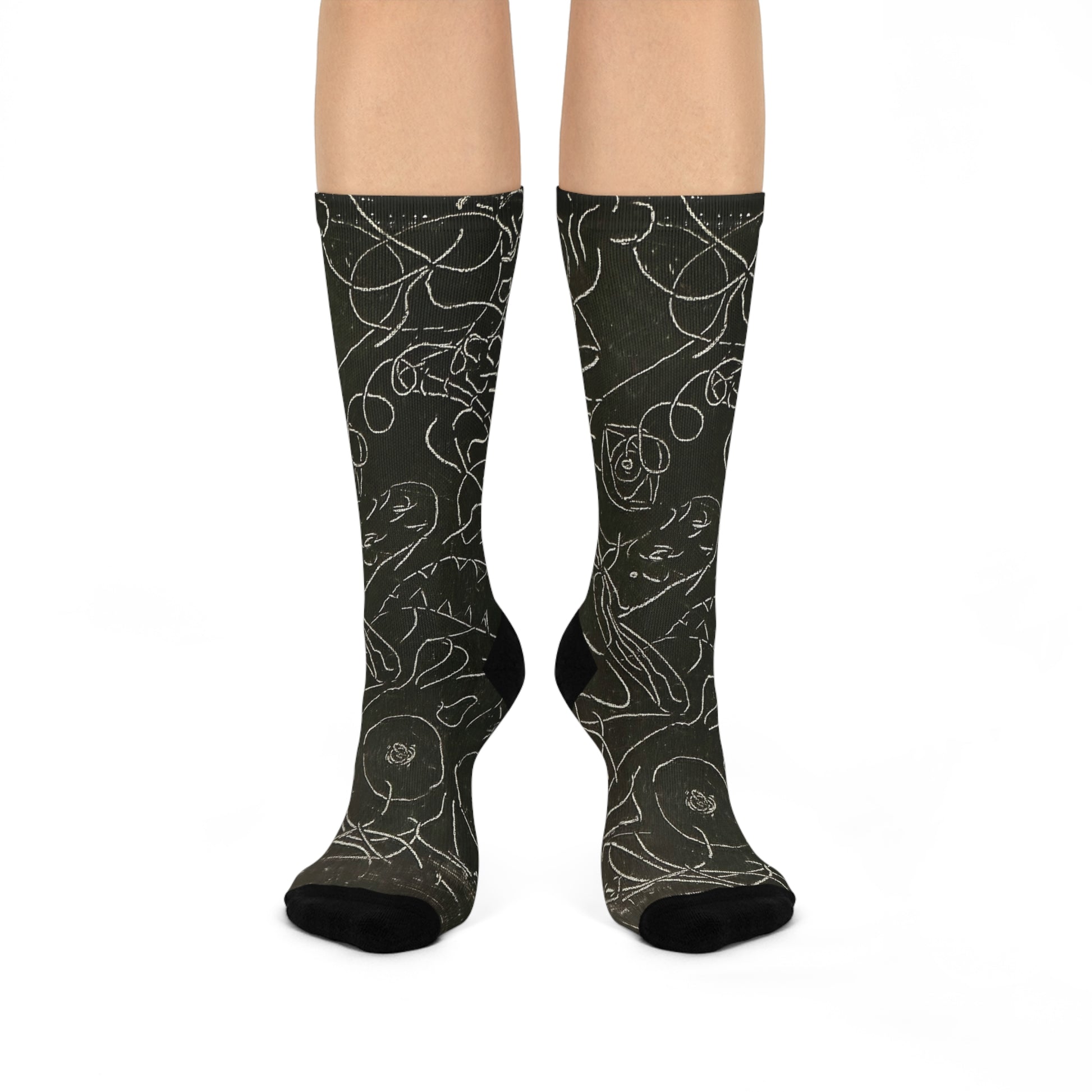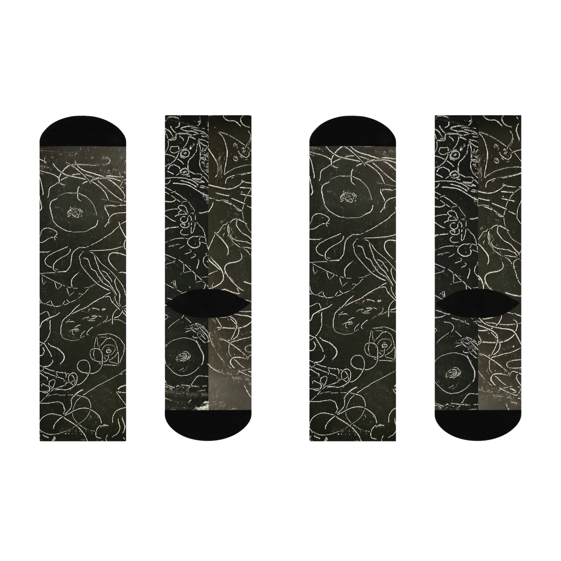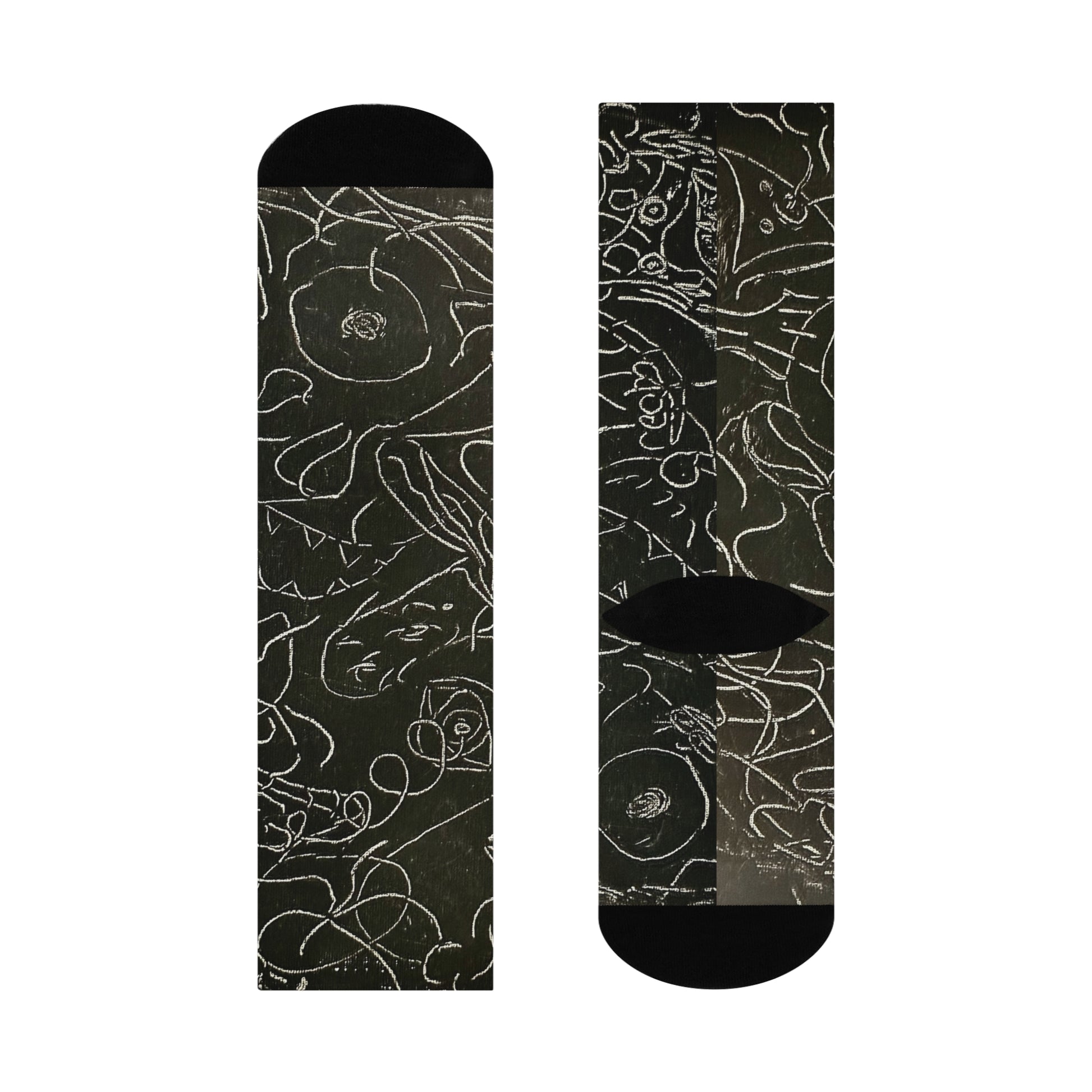 Featuring the mesmerizing white-on-black linework from Kyle’s “Tangled Echoes,” these socks capture the pulse and motion of his original canvas — a reflection of fearless creativity and vibrant energy.
